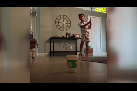هنرمایی عجیب پسربچه 8 ساله با چوب گلف و لیوان یکبار مصرف
