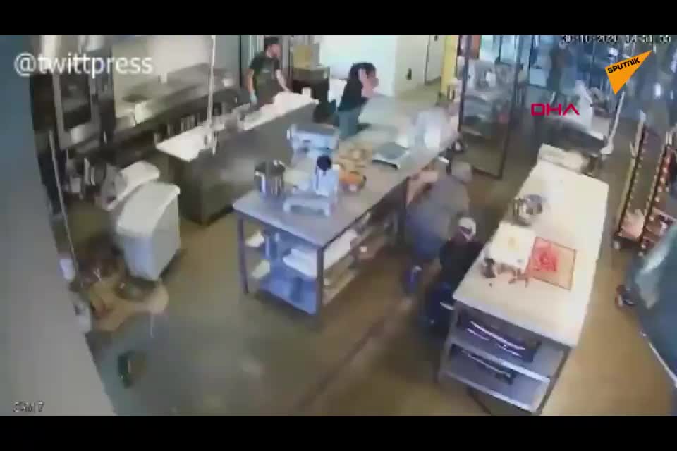 لحظه وقوع زلزله در آشپزخانه هتلی در ازمیر ترکیه