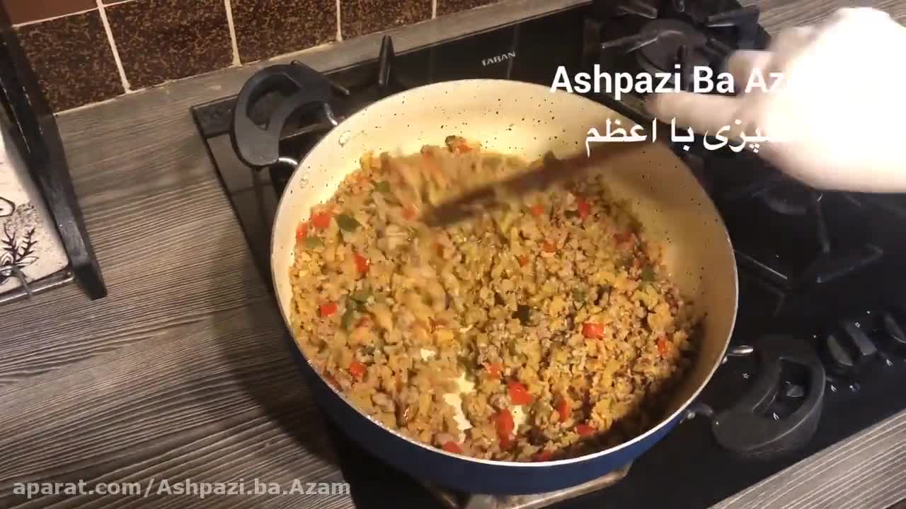 طرزتهیه ماکارونی با گوشت چرخ کرده و سویا همراه با ته دیگ سیب زمینی