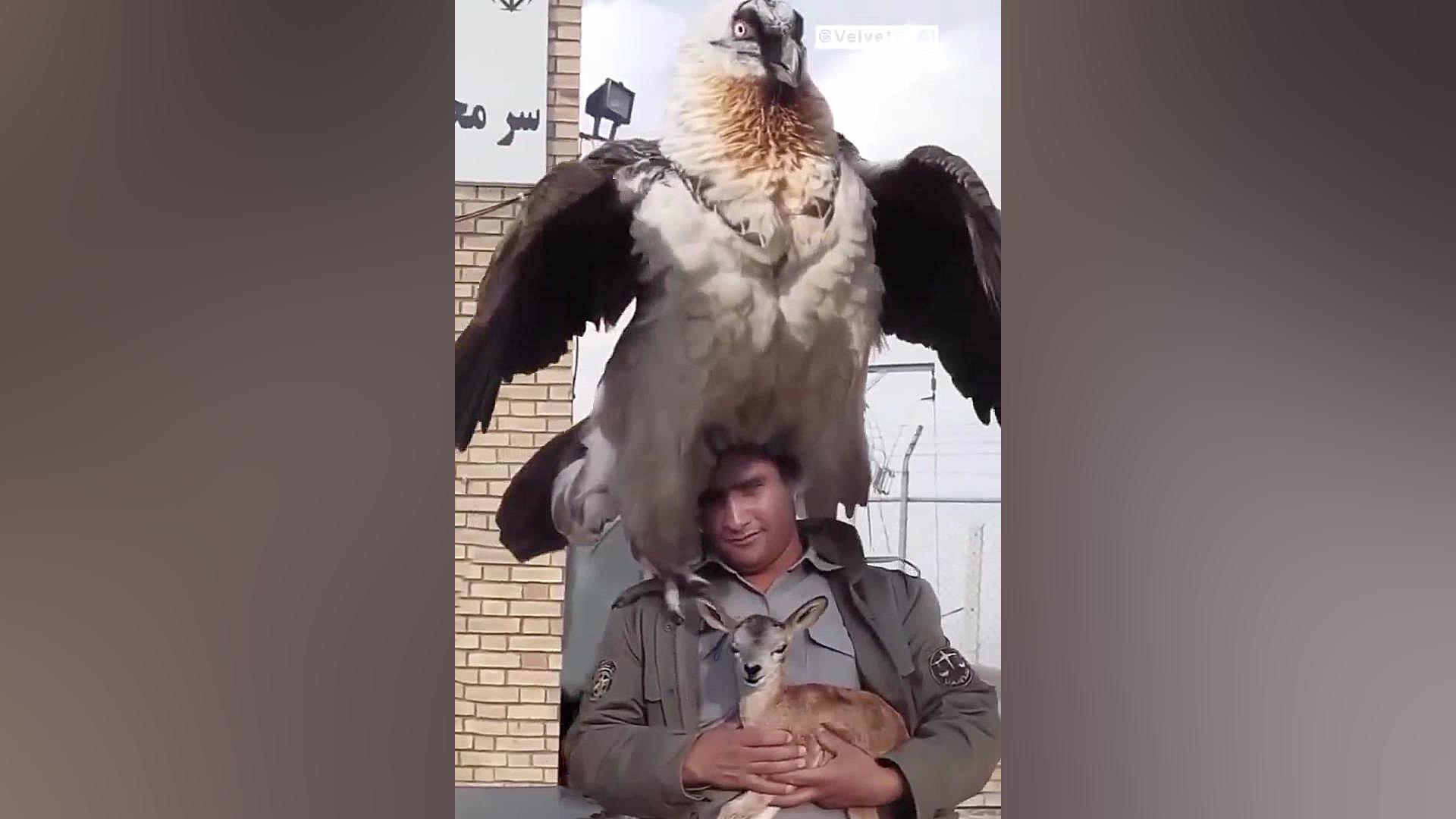 همای سعادت غول پیکر بر روی دوش محیط بان ایرانی