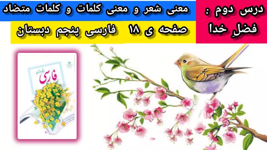 درس دوم فارسی پنجم دبستان فضل خدا - معنی شعر و معنی کلمات و کلمات متضاد
