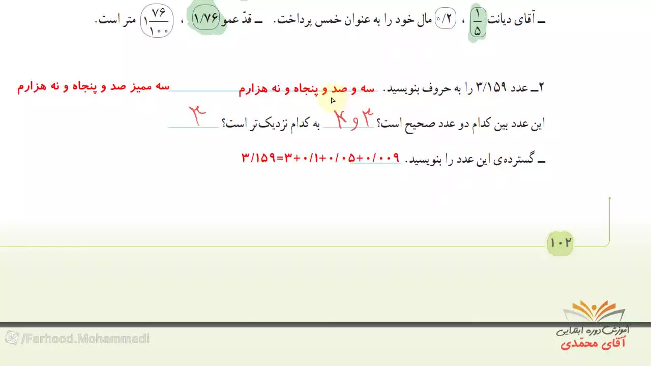 ریاضی کلاس پنجم دبستان - مرور فصل ۵ صفحه 102 و 103 - پایه پنجم دوره ابتدایی
