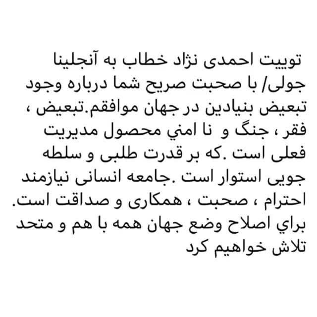 توییت محمود احمدی نژاد در پاسخ به صحبت هنرمند آمریکایی آنجلینا جولی