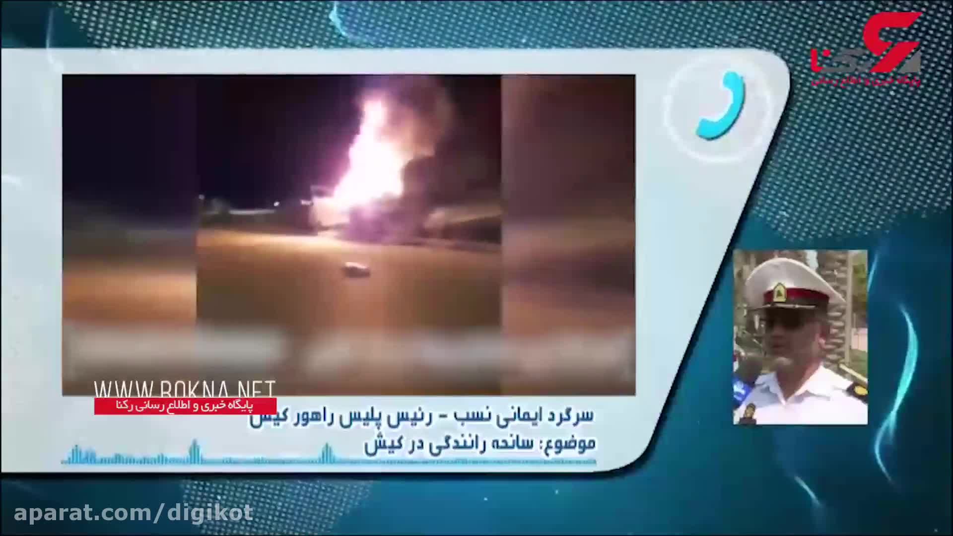حریق ناشی از تصادف خودرو با تیر چراغ برق در کیش