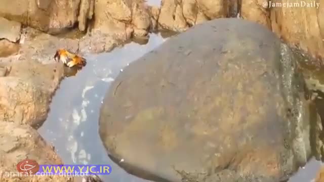 شکار شدن یک خرچنگ توسط اختاپوس در بیرون از آب