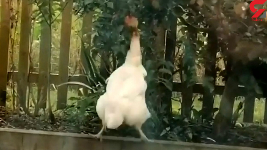تلاش بامزه یک مرغ برای چیدن سیب