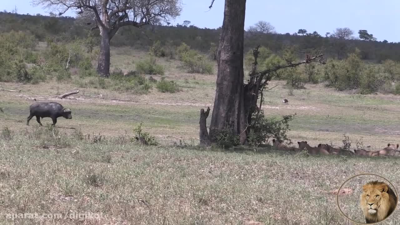 حیات وحش ، عبور بوفالو نگون بخت از میان گله شیرها