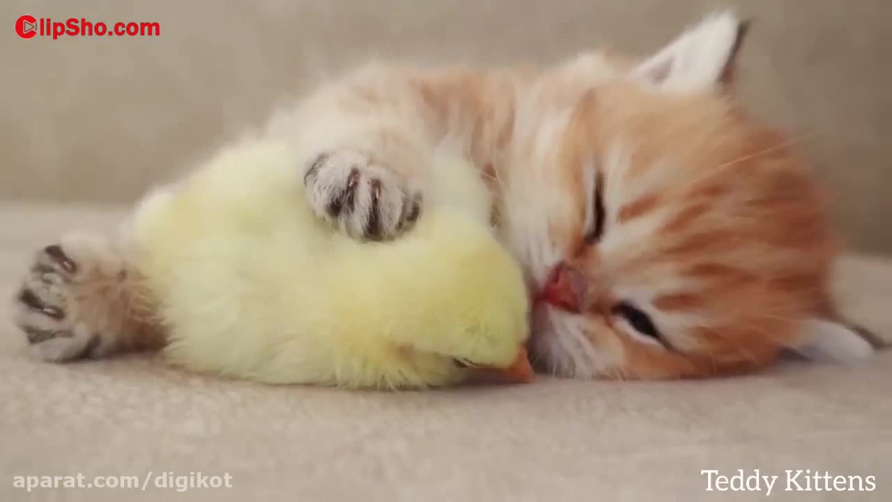 خوابیدن گربه ملوس و جوجه ناز در کنار هم ؛ گربه و جوجه کیوت