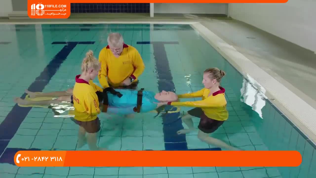 غریق نجات - آموزش انتقال فرد غرق شده روی تخت نجات در آب کم عمق