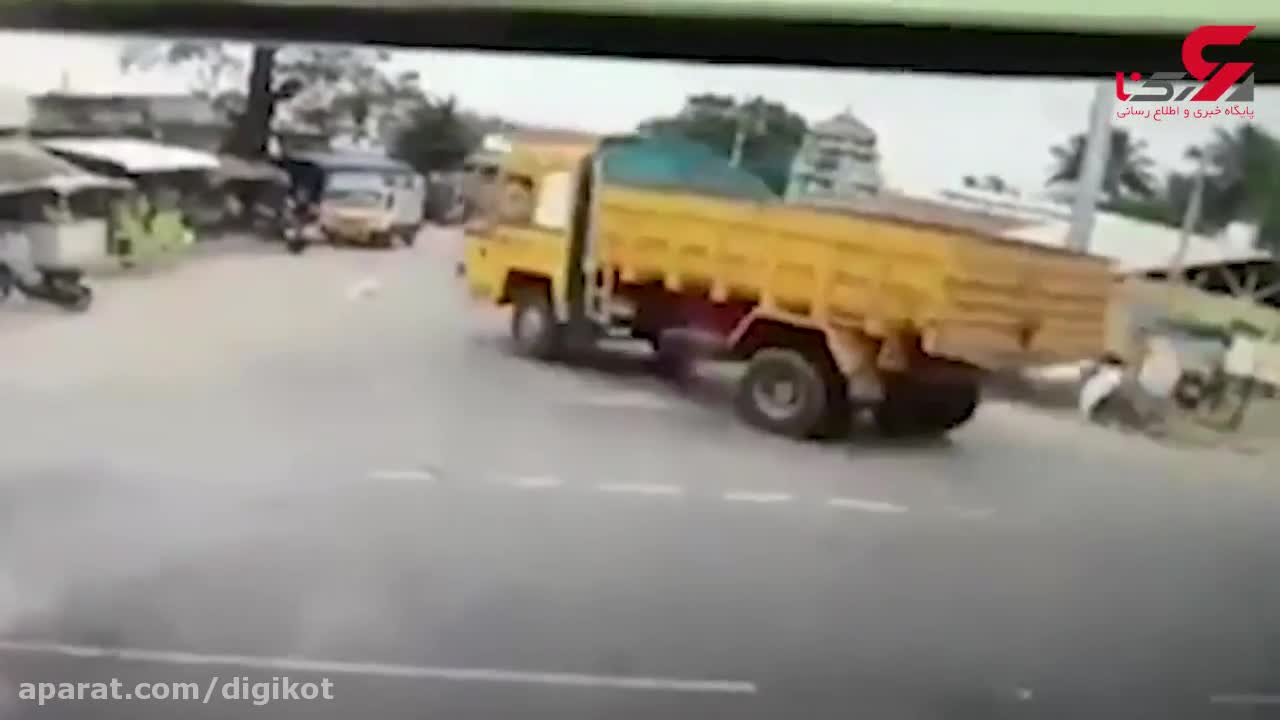 نجات معجزه آسای عابر پس از تصادف با کامیون