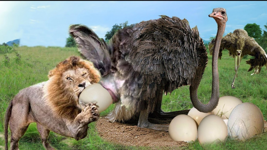 حمله شیر برای شکار ؛ شترمرغ در مقابل شیر