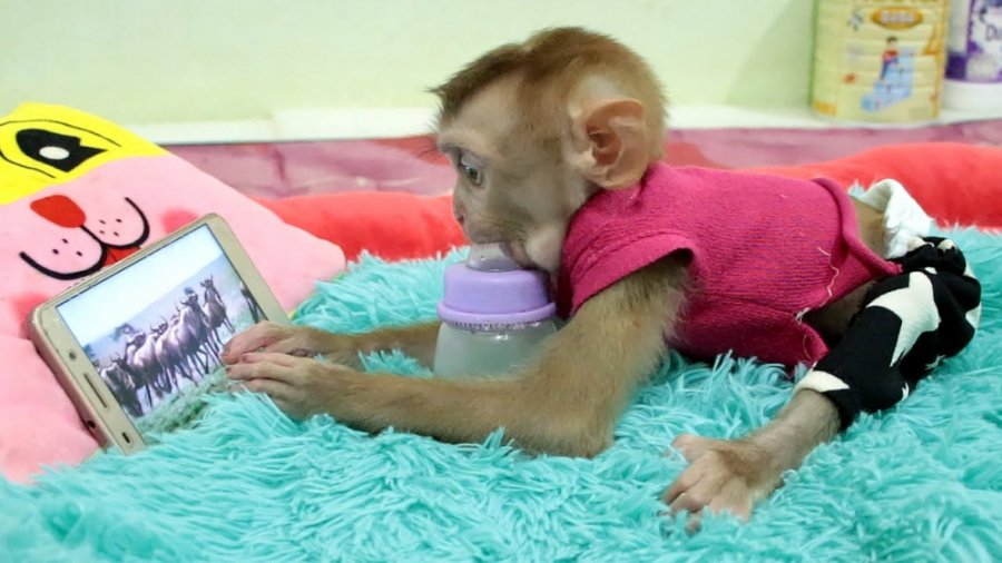 میمون کوچولو در حال شیر خوردن و دیدن راز بقا