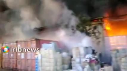 تلاش آتش نشانان برای اطفاء آتش یک انبار بزرگ واقع در بزرگراه فتح بعد از آزادگان