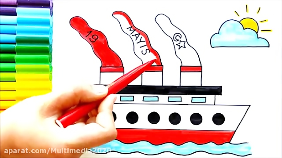 آموزش نقاشی کودکانه | نقاشی کشتی باربری کودکانه