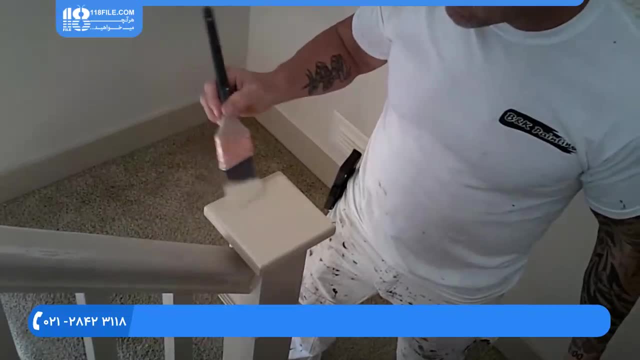 رنگ آمیزی ساختمان- رنگ کردن نرده های راه پله با قلم مو