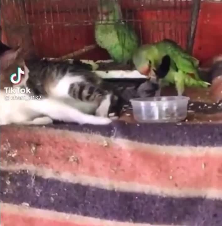 بازیگوشی خندهدار گربه و طوطی خانگی