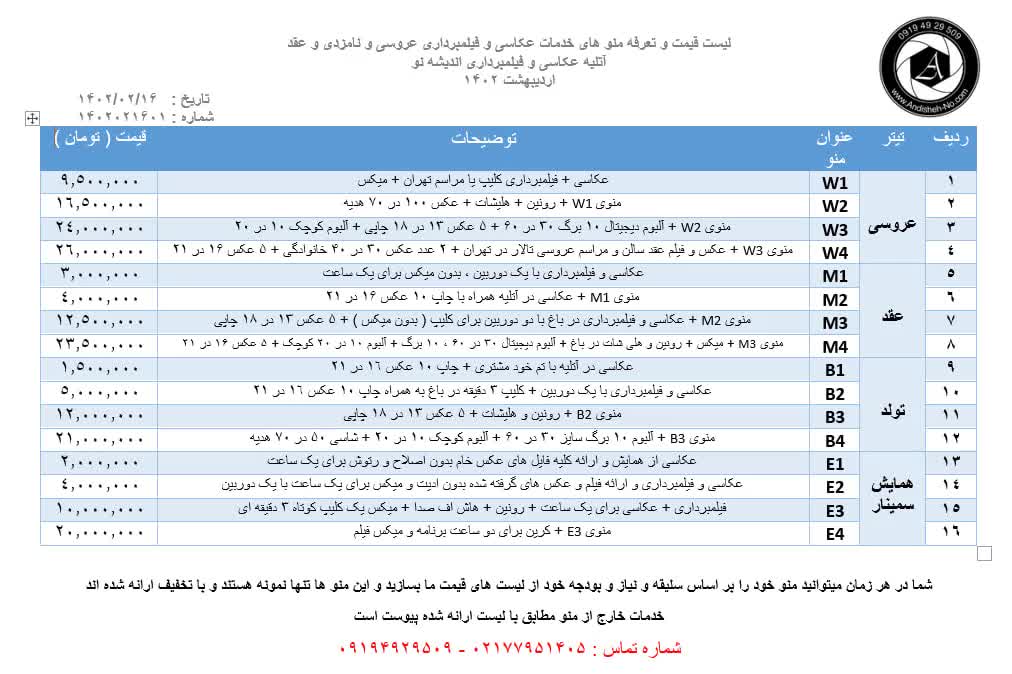 تعرفه قیمت و نرخ خدمات عکاسی و فیلمبرداری آتلیه 1402 عروسی عقد نامزدی همایش تولد