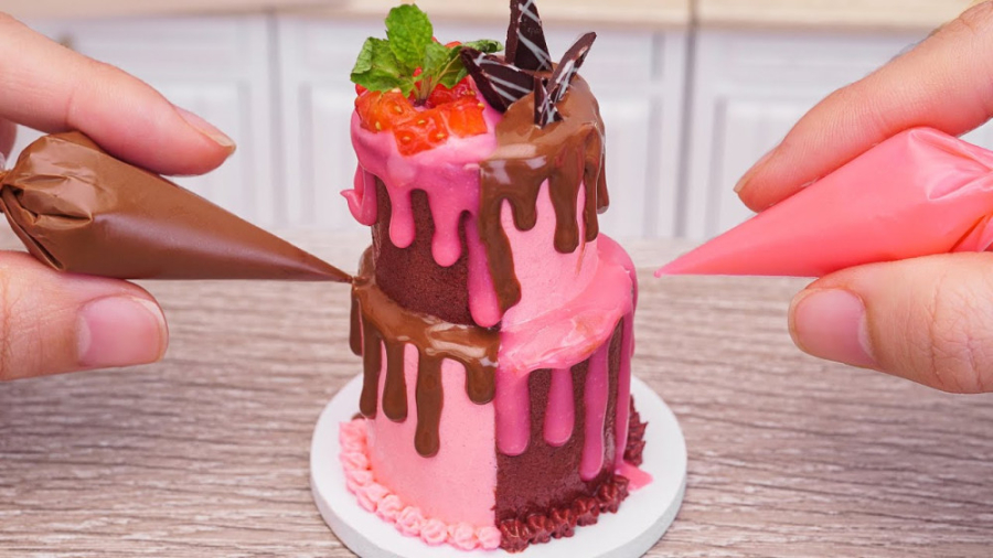 تزیین کیک مینیاتوری نصف شکلاتی نصف توت فرنگی