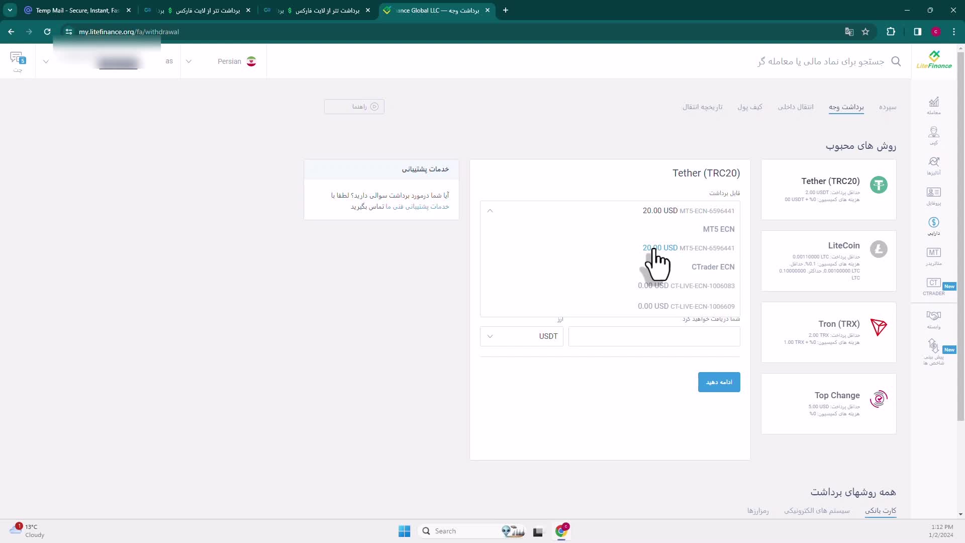 نحوه برداشت تترلایت فارکس2024آموزش برداشت تتر(Tether)بروکرLiteFinance[شماره 59]