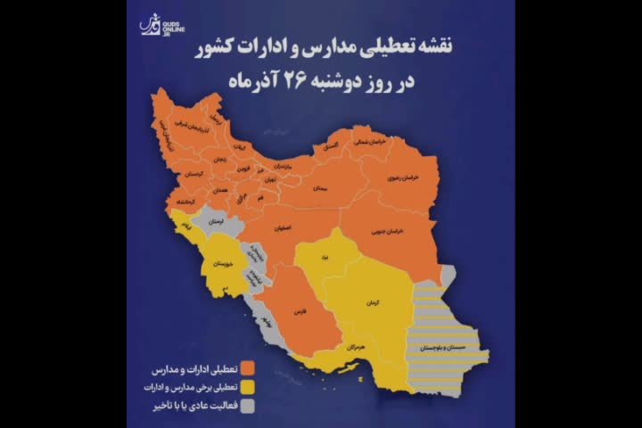 نقشه تعطیلی مدارس و ادارات کشور در روز دوشنبه (تا ساعت ۲۲ شب) | ۲۵ آذر ۱۴۰۳