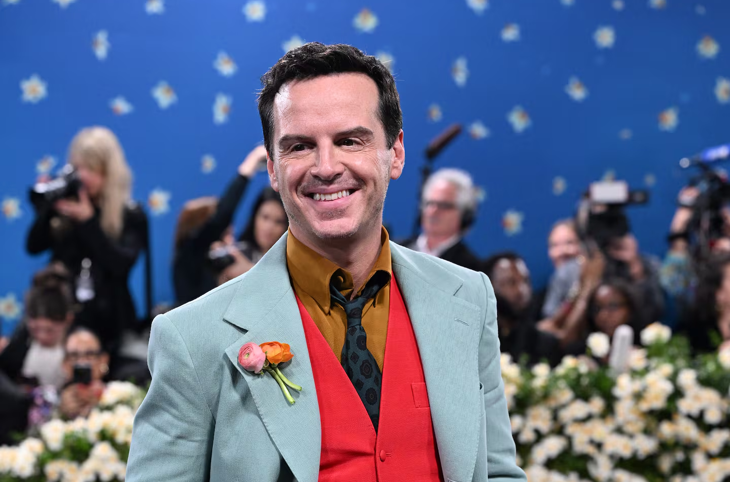 استایل جسورانه اندرو اسکات در مت گالا 2025: کت سبز، جلیقه قرمز و پیراهن خردلی