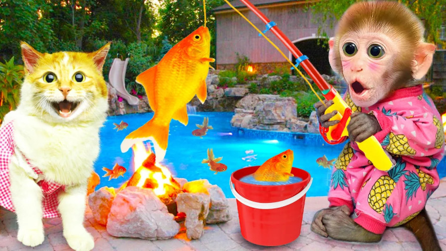 کارتون بچه میمون شیطون: میمون کوچولو با گربه ماهیگیری میکنند!