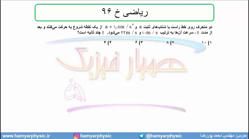جلسه 60 فیزیک دوازدهم - حرکت با شتاب ثابت 28 تست ریاضی خ 96 - مدرس محمد پوررضا