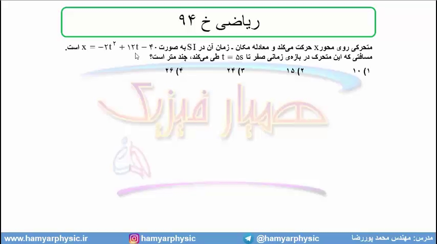 جلسه 58 فیزیک دوازدهم - حرکت با شتاب ثابت 26 تست ریاضی خ 94 - مدرس محمد پوررضا