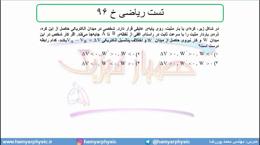 جلسه 62 فیزیک یازدهم - پتانسیل الکتریکی 10 و تست ریاضی خ 96 - مدرس محمد پوررضا
