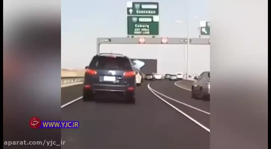 سقوط خوفناک تابلو بزرگراه روی خودروی شاسی بلند