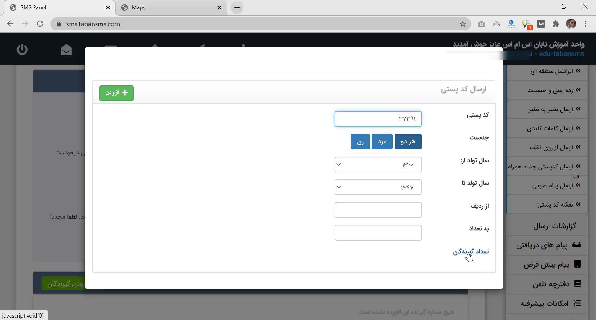 ارسال پیامک از طریق کد پستی شهر و منطقه