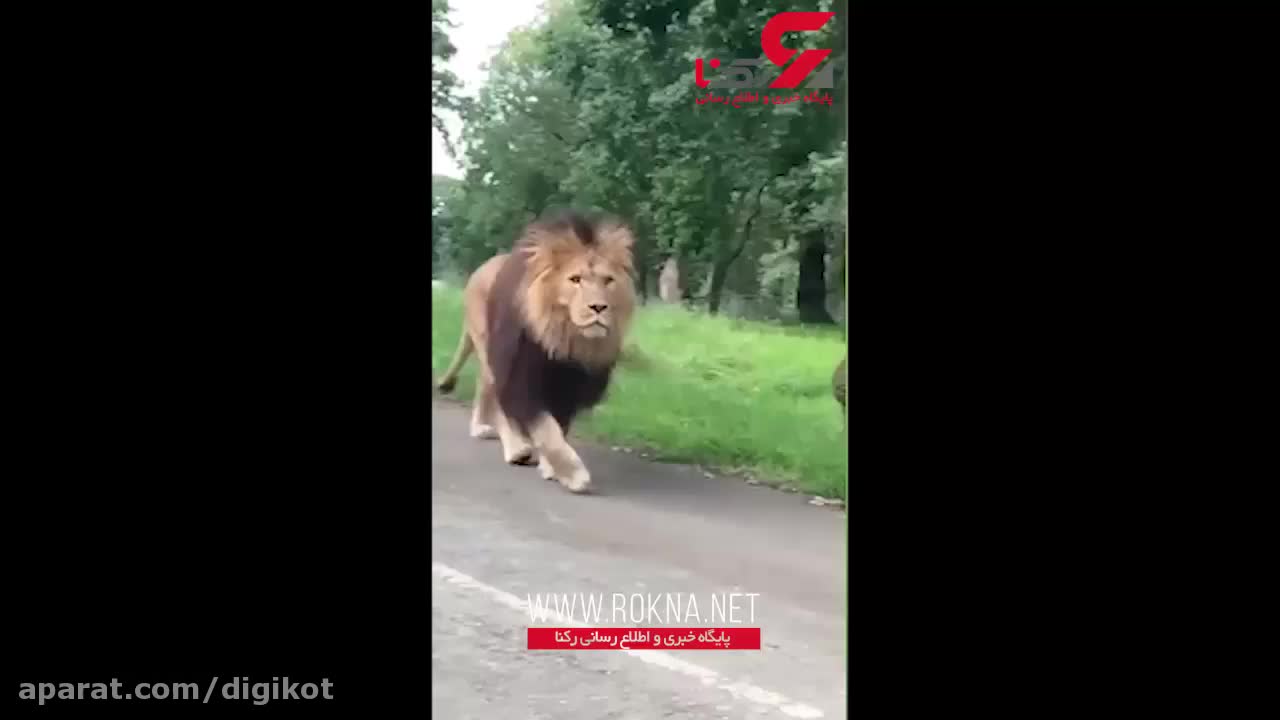 پیاده روی شیر نر غول پیکر در میان خودروهای پارک شده