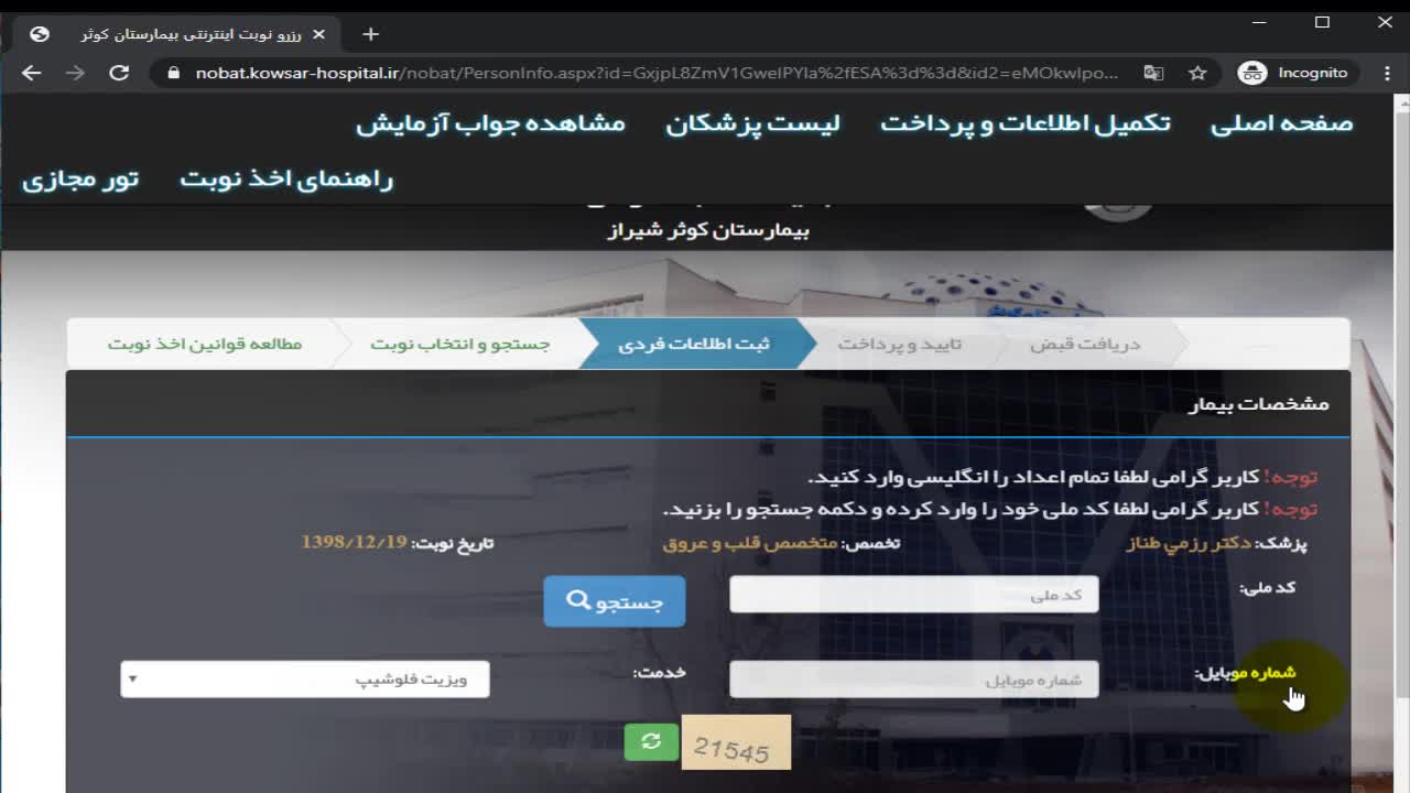 آموزش نوبت دهی اینترنتی بیمارستان کوثر 0